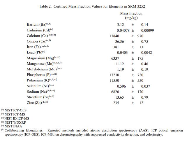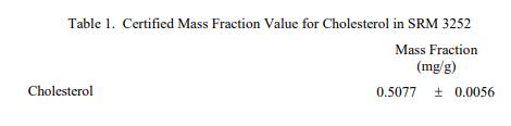 表 1 至表 3 中提供了NIST SRM 3252蛋白質(zhì)飲料混合物中膽固醇、元素和維生素的認證質(zhì)量分數(shù)值,以干質(zhì)量為基礎(chǔ)報告。NIST 認證值是 NIST 認證的值對其準確性的信心最高,因為所有已知或可疑的偏差和可變性來源都已考慮在內(nèi) [1]。價值分配分析由 NIST 和合作實驗室進行。認證值計算為 NIST 方法的平均值和合作實驗室提供的平均結(jié)果的中位數(shù)(在適當?shù)那闆r下)。相關(guān)的不確定性以大約 95% 的置信水平表示 [2-4]。