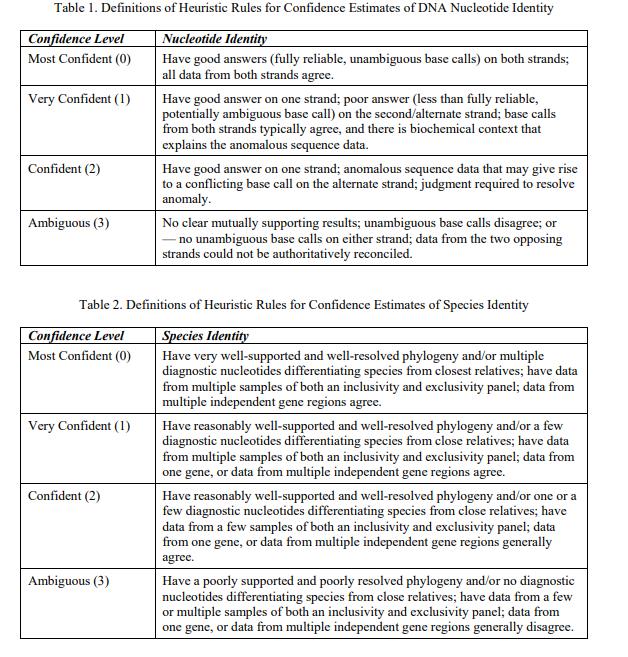 NIST SRM 3246銀杏葉(葉子)經認證的物種鑒定是銀杏,來自 psbA-trnH 基因間間隔區(qū)和 trnL 內含子區(qū)域的相關葉綠體 DNA 序列可在伴隨的 FASTA 格式文件中獲得 [1]。與序列中每個核苷酸相關的不確定性,以及與作為物種標識符的 DNA 序列相關的不確定性,以表示對規(guī)定值的信念強度的序數(shù)尺度表示(0 = 最有信心,1 = 非常有信心,2 = 有信心,3 = 模棱兩可)(表 1 和表 2)[2]。