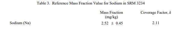 表 3 到表 6 提供了NIST SRM 3234豆粉(標準品) 中鈉、異黃酮、近似物、總膳食纖維、卡路里和氨基酸的參考質量分數值,以干質量為基礎報告。NIST 參考值是未經認證的值,它是基于可用數據對真實值的最佳估計;但是,該值不符合 NIST 認證標準 [1],并且提供的不確定度可能僅反映測量再現性,可能不包括所有不確定性來源,或者可能反映多種分析方法之間缺乏足夠的統計一致性。參考質量分數值來自 NIST 或合作實驗室報告的結果。