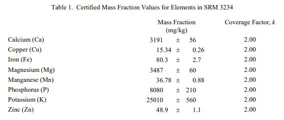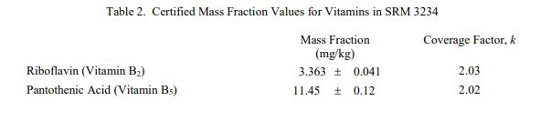 表 1 和表 2 提供了NIST SRM 3234豆粉(標準品)  中元素和維生素的認證質量分數值,以干質量為基礎報告。NIST 認證值是 NIST 對其準確性有最高置信度的值因為所有已知或可疑的偏見來源都已被調查或考慮 [1]。價值分配分析由 NIST 和合作實驗室進行。認證值計算為 NIST 方法的平均值和合作實驗室提供的平均結果的中位數(在適當的情況下)。所有值在沒有加權的情況下合并。相關的不確定性以大約 95% 的置信水平表示 [2-4]。