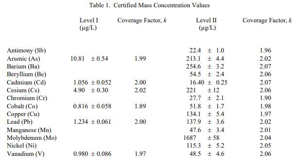 表 1 列出了 SRM 2668 人尿液中的有毒元素標(biāo)準(zhǔn)品 的 I 級 6 種元素和 II 級 14 種元素的認(rèn)證質(zhì)量濃度值。 NIST 認(rèn)證值是 NIST 對其準(zhǔn)確性有最高信心的值已知或可疑的偏見來源已被調(diào)查或考慮帳戶 [1]。數(shù)值來自 NIST 和合作實驗室提供的結(jié)果的組合。